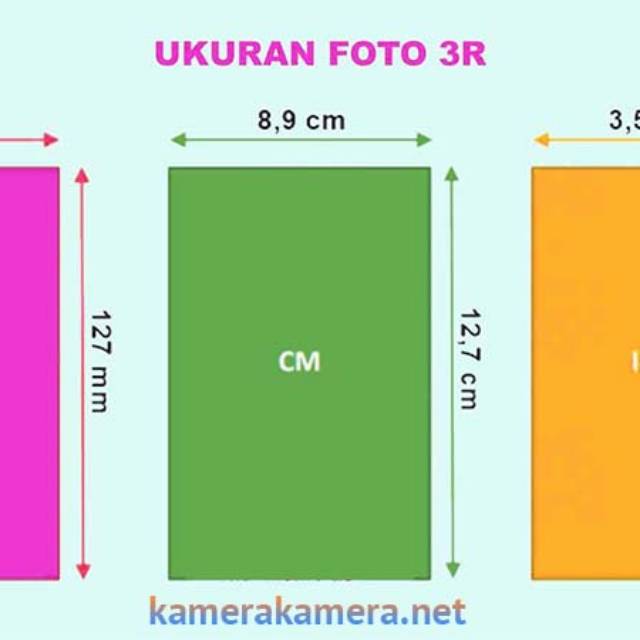 127 mm adalah panjang dari foto ini, sementara itu 89 mm ada lebar fotonya. Foto 3r memiliki ukuran setara dengan 89 x 127 milimeter. Ukuran foto 3r dalam inchi. Ukuran ini banyak sekali dipakai oleh beberapa orang. Ukuran foto 3r dalam centimeter sedangkan dalam satuan centimeter ukurannya yaitu 8,9 x 12,7 cm, yang berarti foto tersebut memiliki panjang 12,7 cm dan lebarnya 8,9 cm.